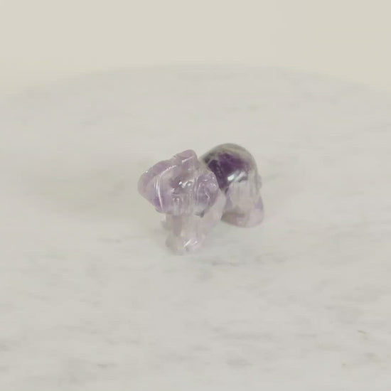 This particular statue is formed from pure Amethyst for overall healing and protection. It weighs approximately 0.1lbs and sits at about 1.5" tall.