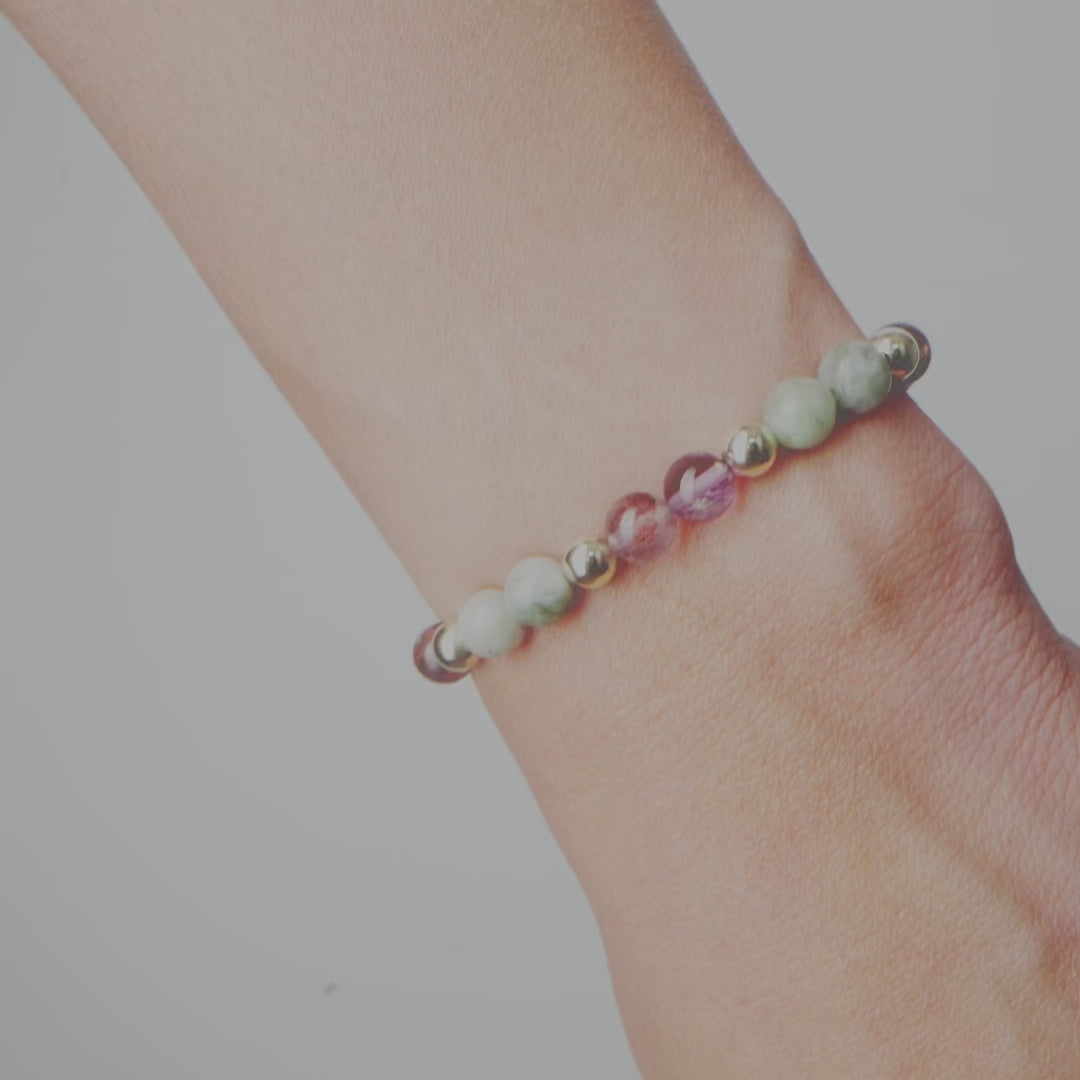 Jade promotes wealth, wisdom, and protection, making it a timeless symbol of good fortune. Paired with the rare and powerful Super Seven crystal, known for amplifying spiritual connection and manifesting one's truest desires, this bracelet becomes a magnet for positive transformation. Each 6mm bead is thoughtfully energized, while gold-filled beads add a touch of luxurious radiance, embodying warmth, strength, and endless potential.