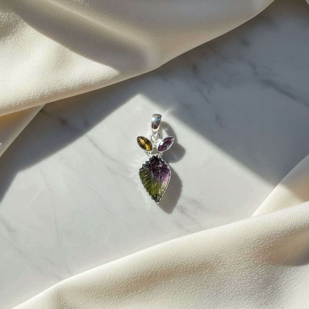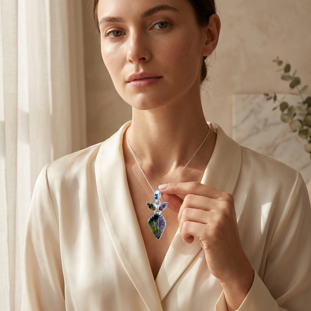 Radiant watermelon tourmaline captures nature's most enchanting color palette—soft pink centers melting into vibrant green edges. This Grade A gemstone is hand-selected for its striking bi-color beauty and suspended from genuine sterling silver, creating a piece that celebrates both elegance and natural wonder. The 18-inch chain sits perfectly at the collarbone, making this necklace an ideal everyday statement or a meaningful gift for someone drawn to gemstone energy and timeless design.