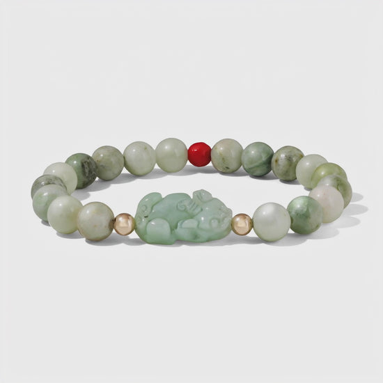 Embrace ancient prosperity traditions with our Green Jade Pixiu Bracelet With REAL Gold, a powerful Feng Shui talisman designed to attract wealth, safeguard your fortune, and balance your energy. Hand-strung with natural green jade beads, this bracelet features a finely carved Pixiu centerpiece—an auspicious creature known to guard riches and invite abundance.