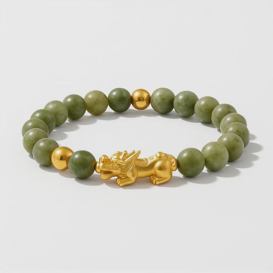 Adorned with a striking gold Pixiu, a mythical creature believed to attract wealth and prosperity, this accessory is not just a fashion statement but a talisman for abundance. Elevate your style while embracing the positive energy of jade and the fortune of the Pixiu.