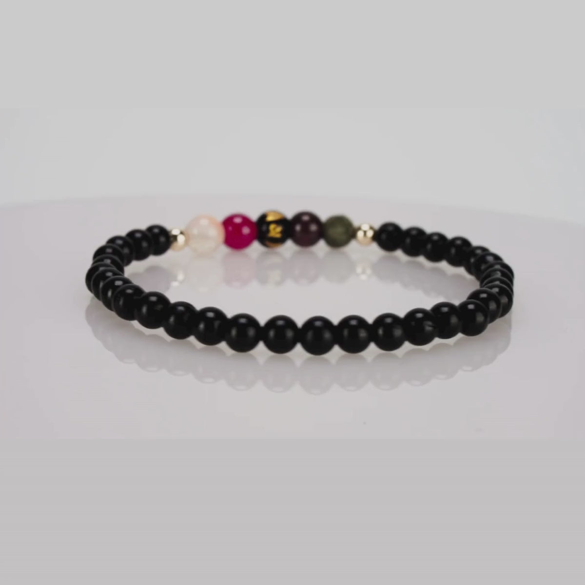 On one side of the obsidian, you'll find a rich garnet bead symbolizing vitality, followed by a soothing jade bead representing harmony, and finally, a gleaming 10k gold bead adding a touch of opulence. On the other side, a vibrant ruby bead embodies passion, while a radiant citrine bead embodies abundance, both complemented by another 10k gold bead.