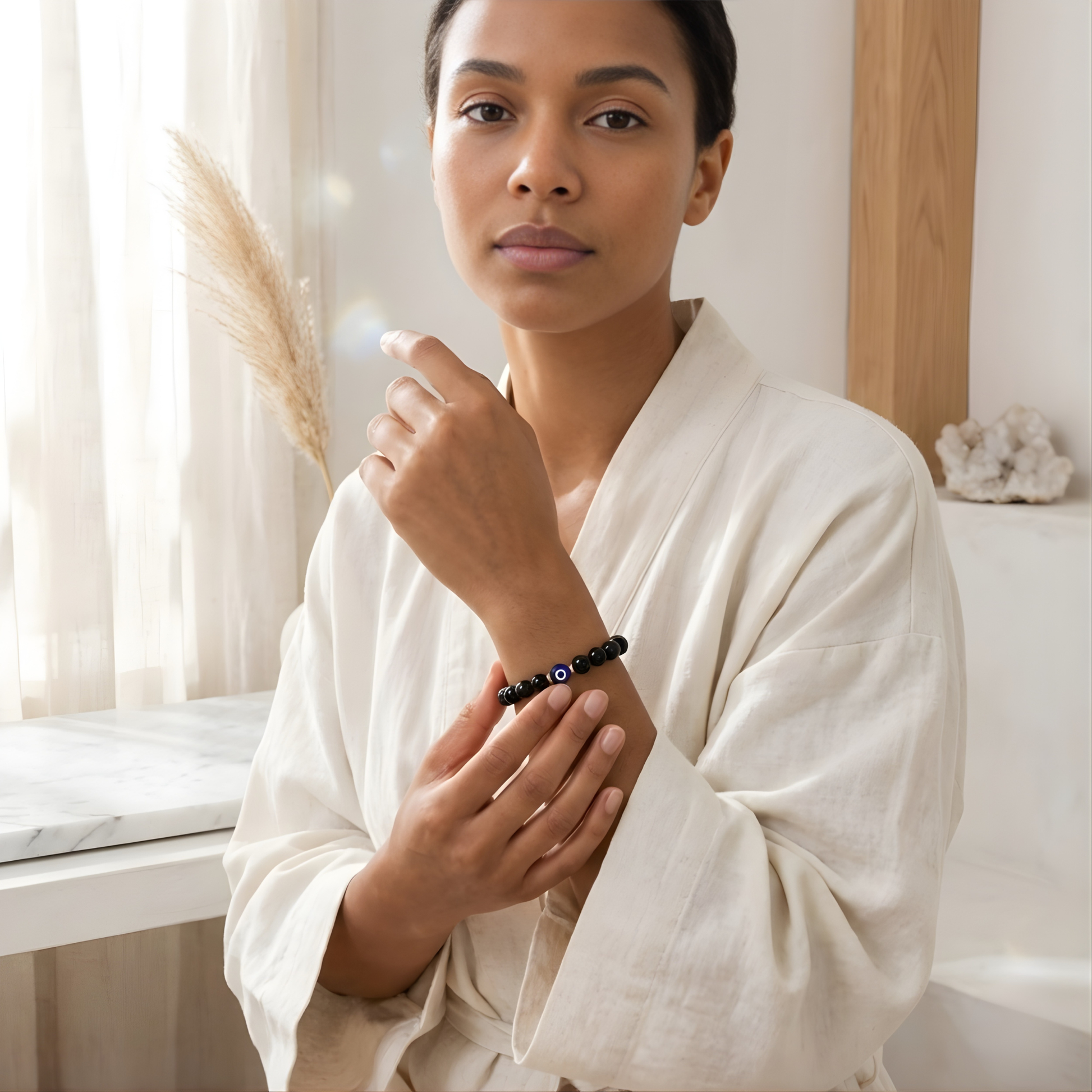 Scorpio Evil Eye Black Obsidian Crystal Protection Bracelet - An intense fusion of protective evil eye symbolism and powerful black obsidian crystal, designed specifically for Scorpio energy.