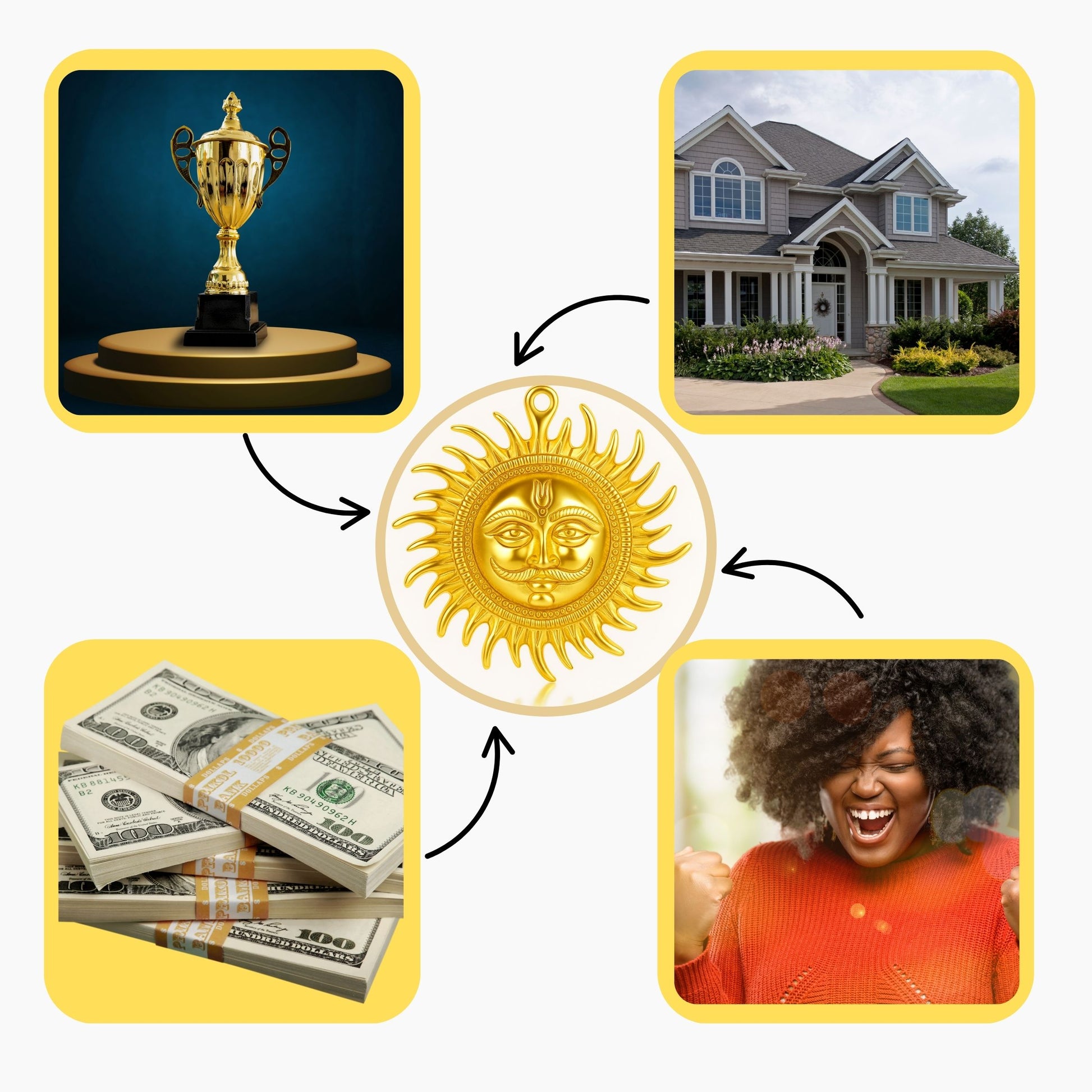 Crafted with precision and blessed for maximum potency, this medallion works as an energetic beacon—dispelling stagnancy, amplifying ambition, and attracting opportunities that align with your highest goals. Whether you’re aiming for career advancement, business growth, or personal triumphs, this powerful remedy channels the Sun’s golden frequency to illuminate your path.