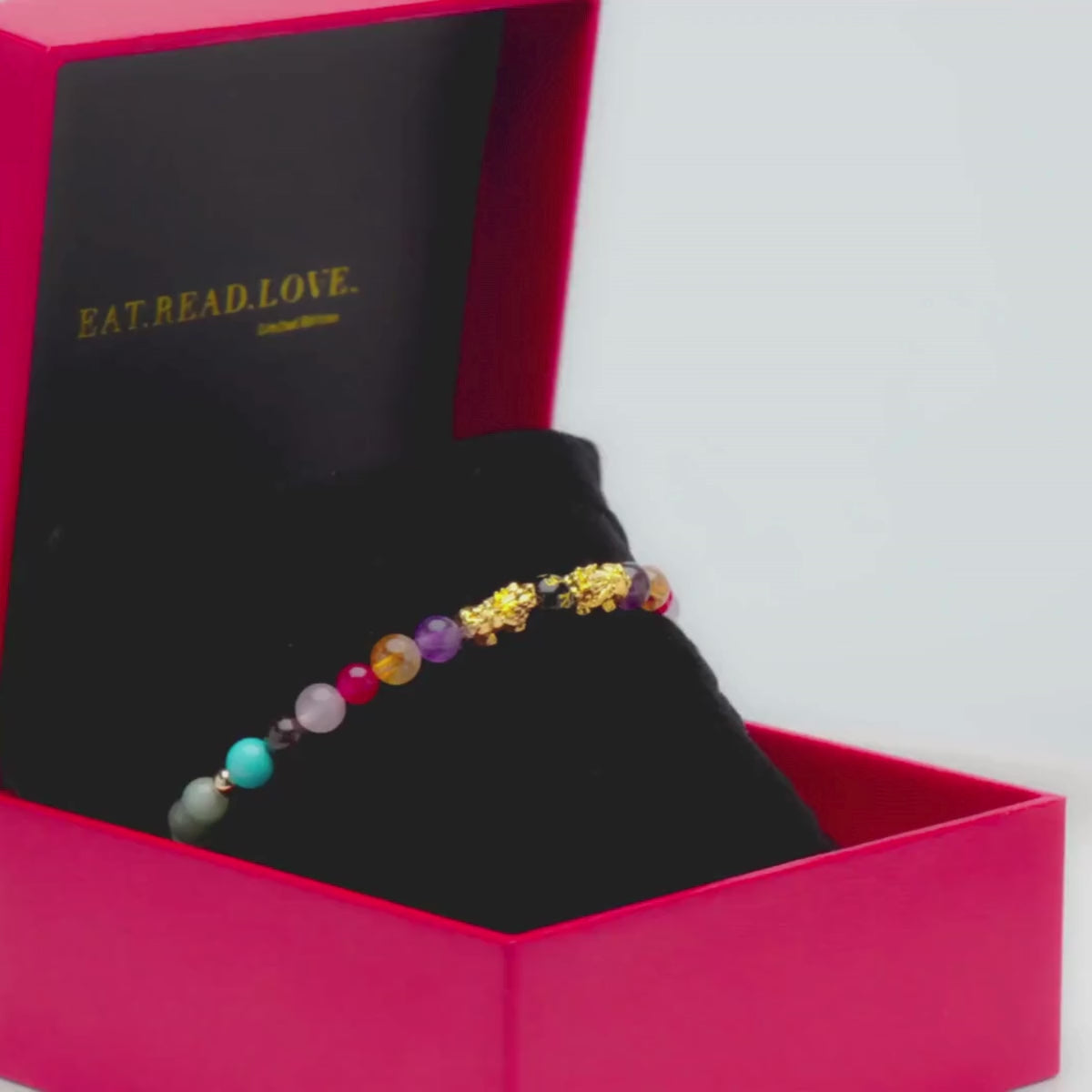 This Unlimited Fortune bracelet features a Double Pixiu design made of 18k pure gold and includes Amethyst, Black Obsidian, Citrine, Ruby, Rose Quartz, and Jade gemstones. Enjoy increased luck and fortune with this stunning and powerful piece.
